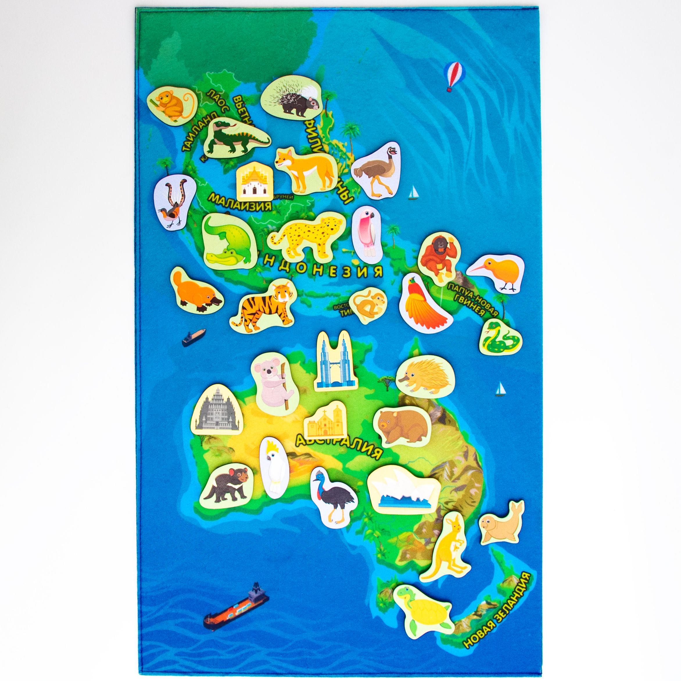 В комплект входят деревянные детали – животные, обитающие в Австралии и Азии. Деревянные детали с обратной стороны имеют липучки, которыми они прикрепляются к карте – основе.