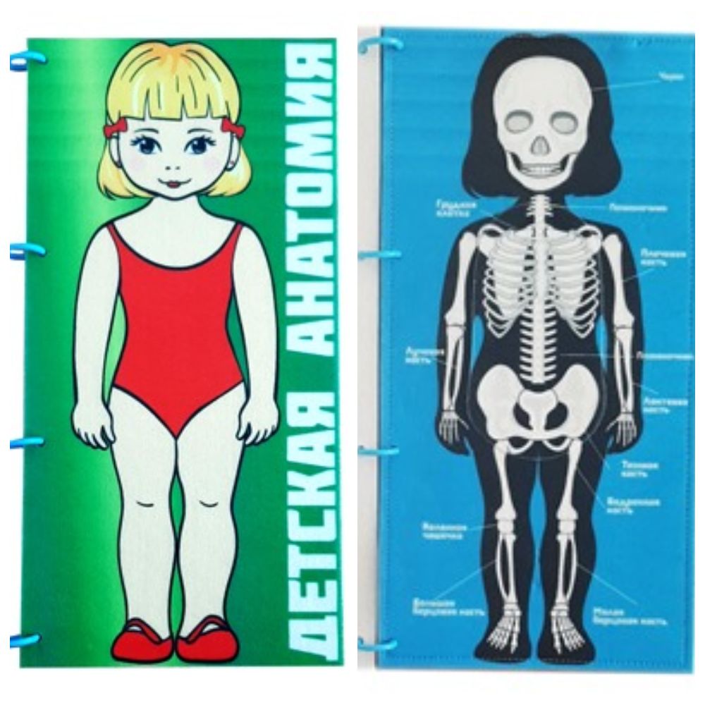 На поле папке изображен детский скелет и внутренние органы с их названиями и расположением. Собирается и разбирается как пазл.
