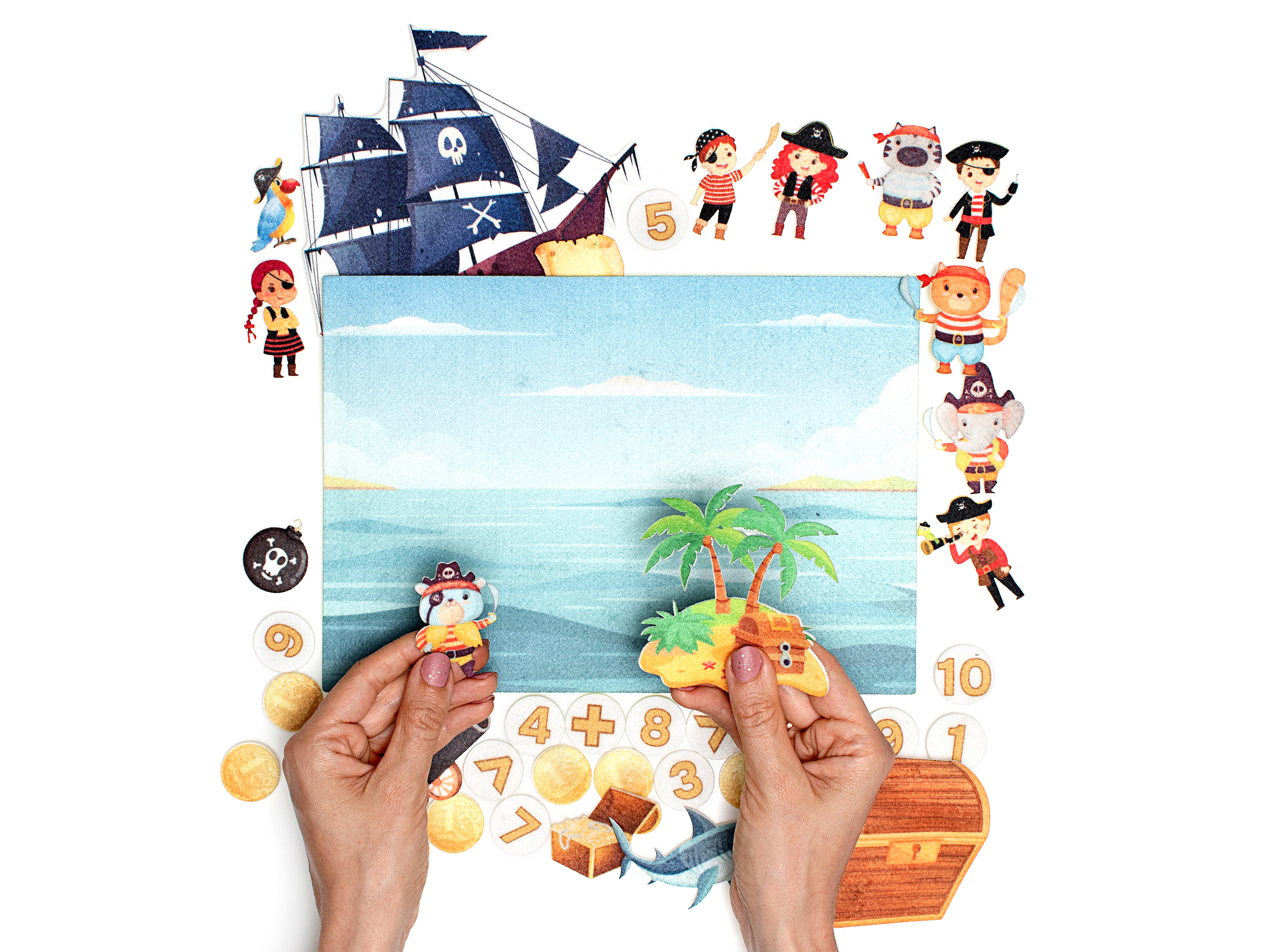 Игровое поле с карманом 28х20 см. Фигурки: Сундук -1, монеты - 10, команда пиратов - 5, цифры и метематические знаки - 15, остальные фигурки - 7.
