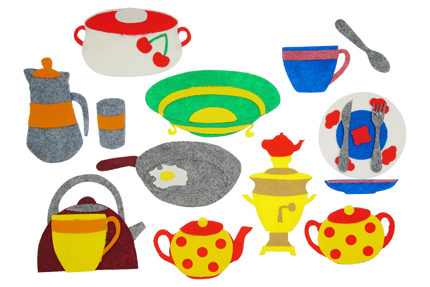 Тарелка, самовар,кружка, чашка, блюдце, сахарница, заварочный чайник, кувшин, ложка, вилка, нож, чайник, стакан, кастрюля, сковородка, миска, поле 25*35см. Фигурки от 6*8см до 25*17см.