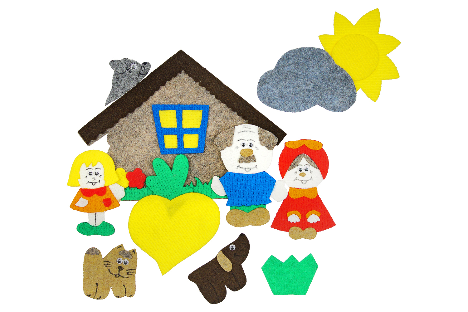 Изба, солнце, облако, травка, дед, бабка, внучка, жучка, кошка, мышка, репка, игровое поле 25*35. Фигурки от 2*3см до 25*25см,