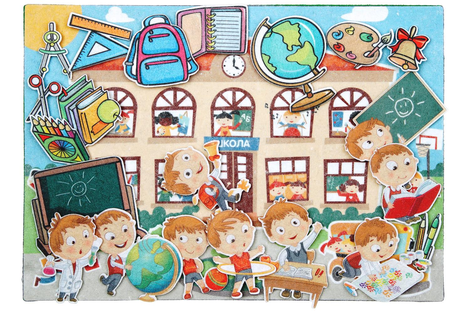 Игровое поле с карманом 28*20см, фигурки учеников с предметами-символами разных уроков, аксессуары. Фигурки от 13*2см до 7*6см