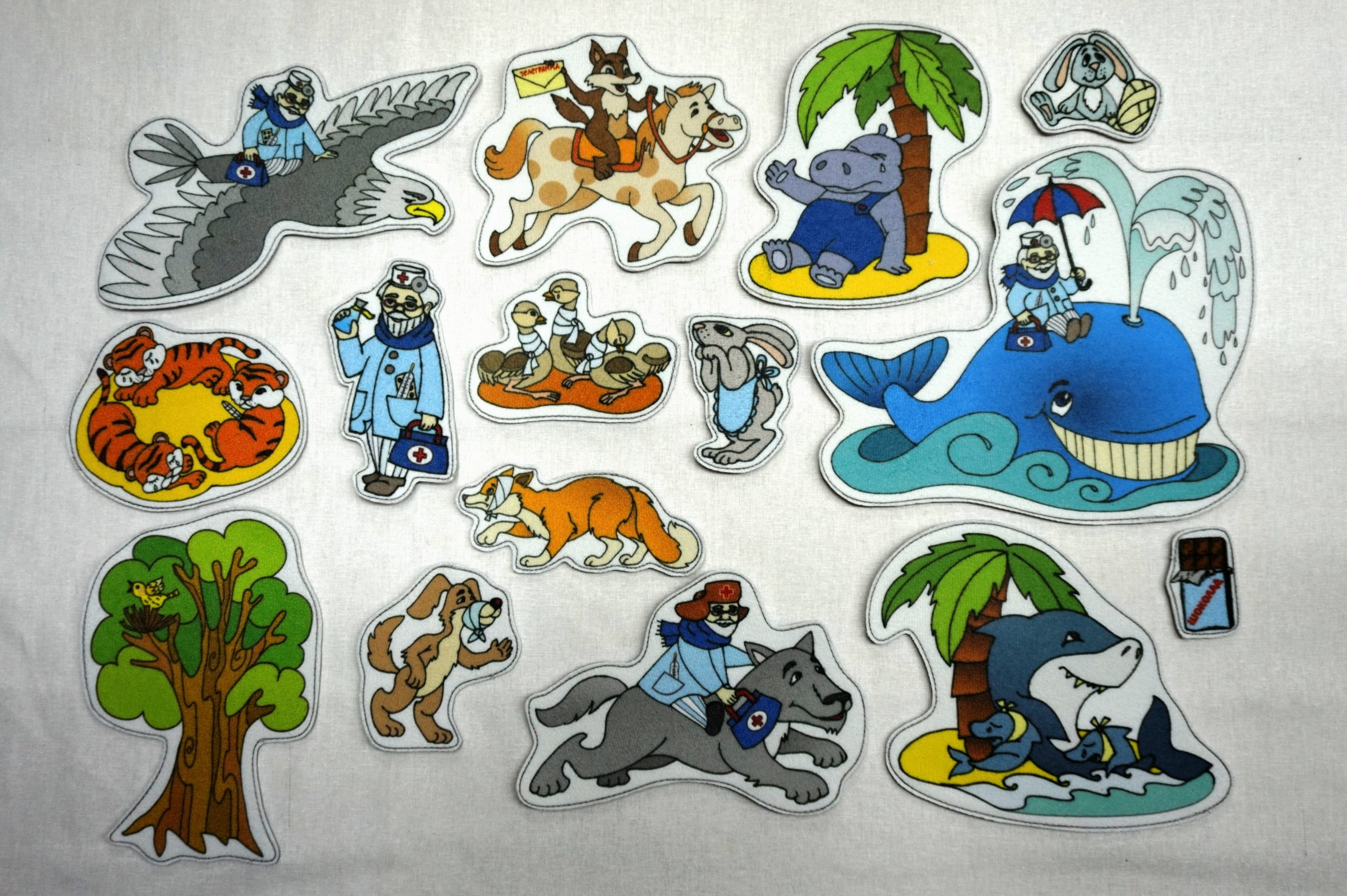Набор иллюстрирует детскую сказку Корнея Чуковского «Доктор Айболит». Каждая фигура снабжена липучкой (лентой Velcro). Данный набор подходит для работы с игровым полем.