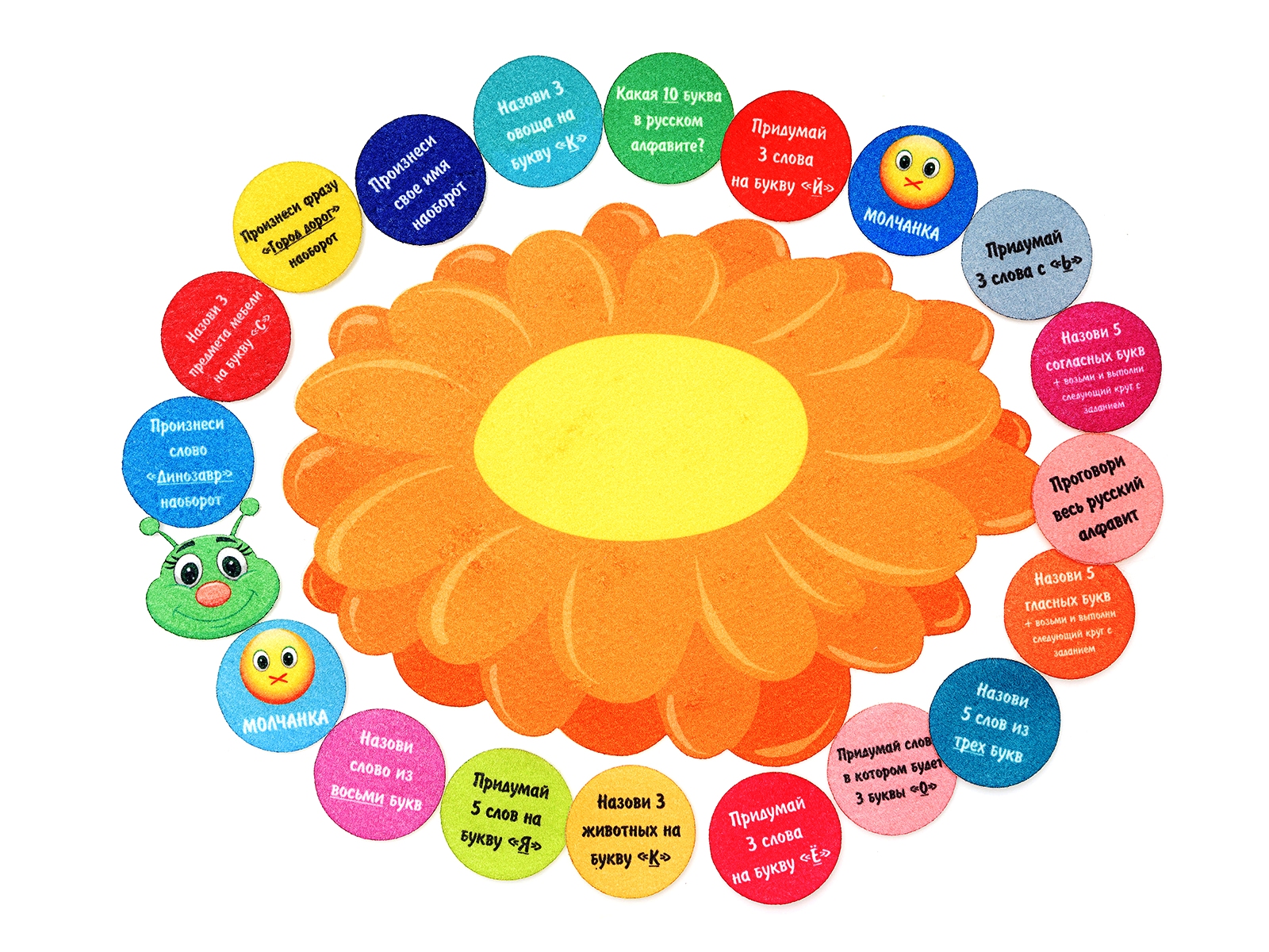 Цветок 27*20см, кружки с заданиями 4,5см, голова гусенички 3,5*4,5см. Фигурки на липучках.
