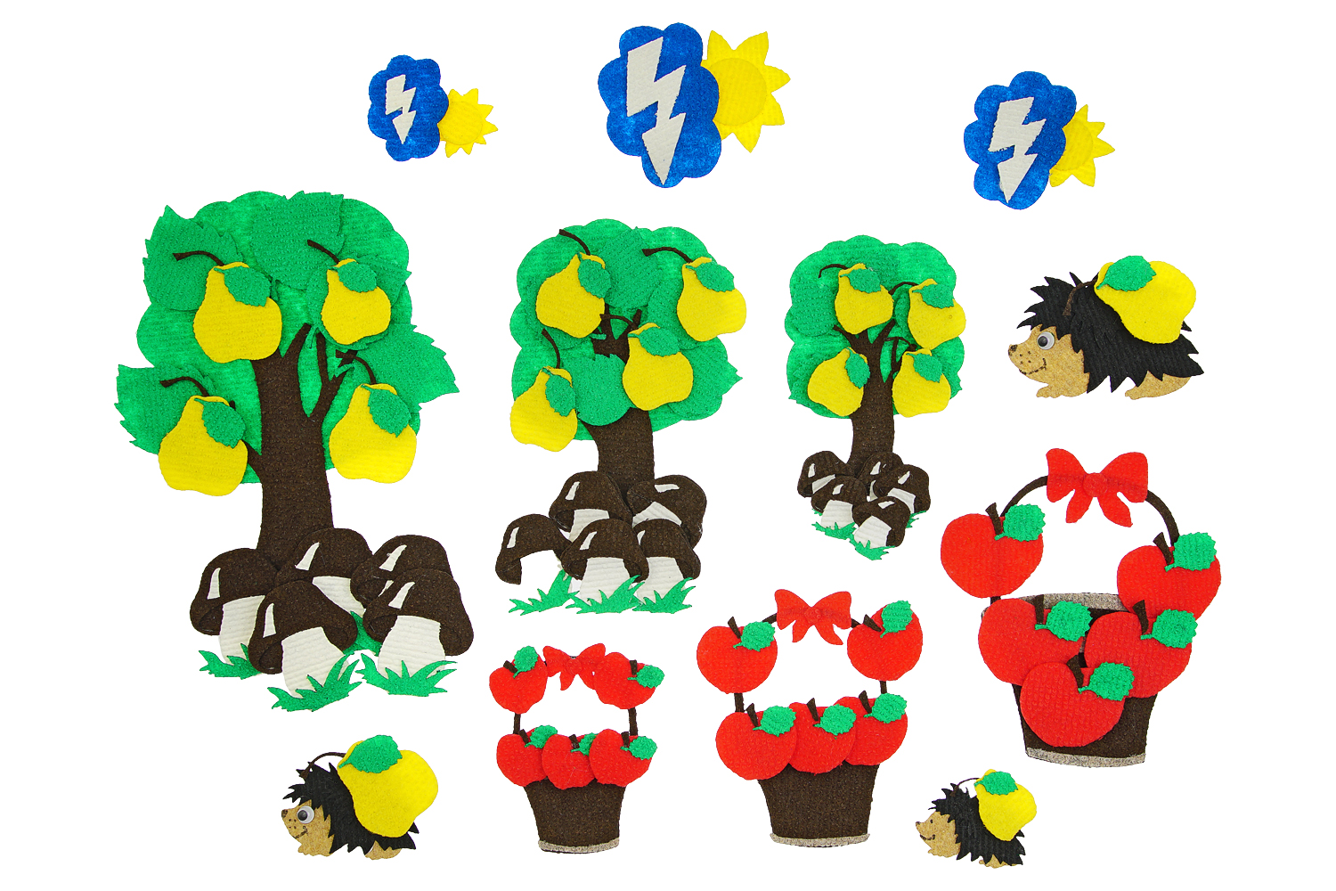 Дерево разного размера-3шт. + яблоки, груши, грибы по 15 шт., солнце-3 шт., облако-3 шт., молния-3шт., ежик-3шт., листики по 9шт. поле 28*45см. Фигурки от 2*2см до 20*22см