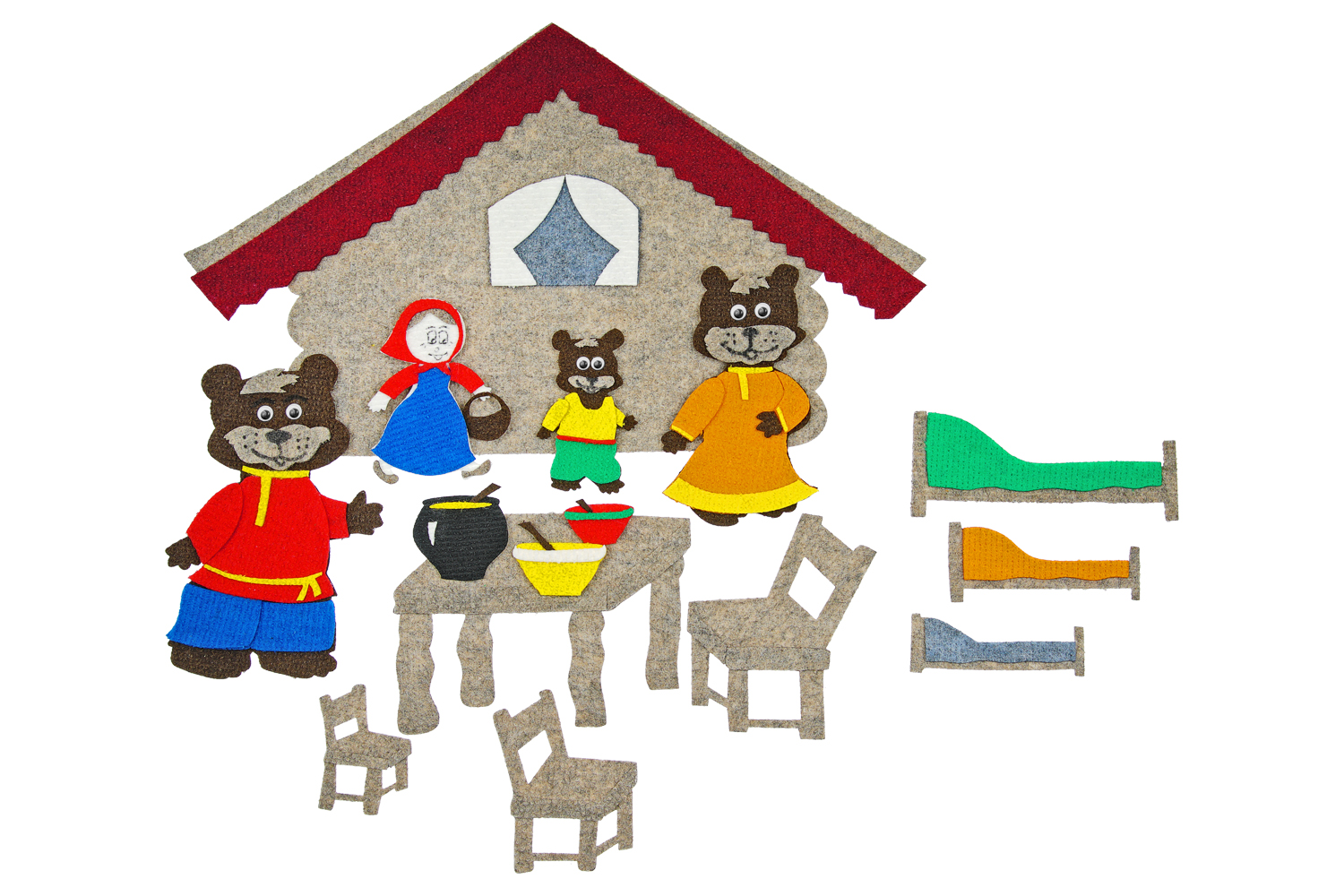 Изба 30*50см, медведь, медведица, медвежонок, стул-3шт., кровать-3шт., стол, горшочек, тарелки 3шт., девочка. Фигурки от 4*4см до 20*12см.