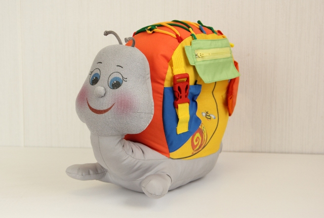 На ней Вы найдете различные виды застежек (шнуровка, карабин, липучка, кнопка, молния). Игрушка содержит материалы различных фактур. Все это будет способствовать развитию сенсорных и психических функций у Вашего ребенка.