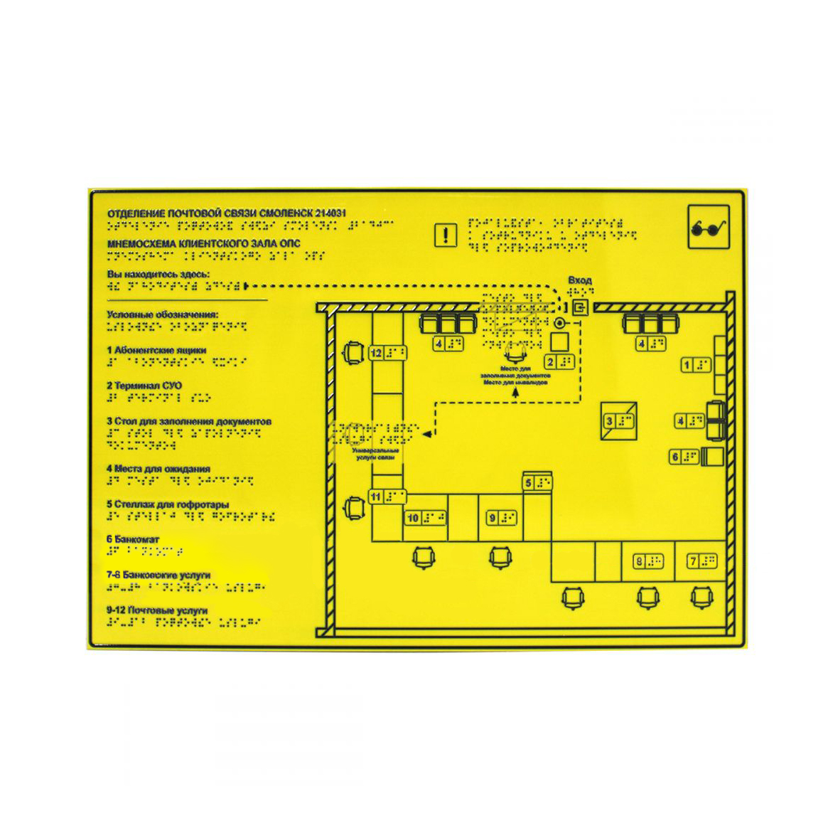 Тактильная мнемосхема – это особенное тифлотехническое средство для пространственного ориентирования людей с ограничениями по зрению, выполненная с применением тифлографической схемы и текстовой информации, дублируемой по системе Брайля. Мнемосхема легко монтируется, как на настенное крепление, так и на вертикальную стойку, что позволяет разместить её в любом помещении наиболее подходящим способом. Монохромные тактильные мнемосхемы являются экономичным решением адаптации пространства для незрячих людей. Мнемосхемы по системе Брайля являются важным элементом тактильной адаптации помещений для незрячих. Регламентируется нормативным документом СП 59.13330.2020. Выполнено по ГОСТ Р 56832-2020.