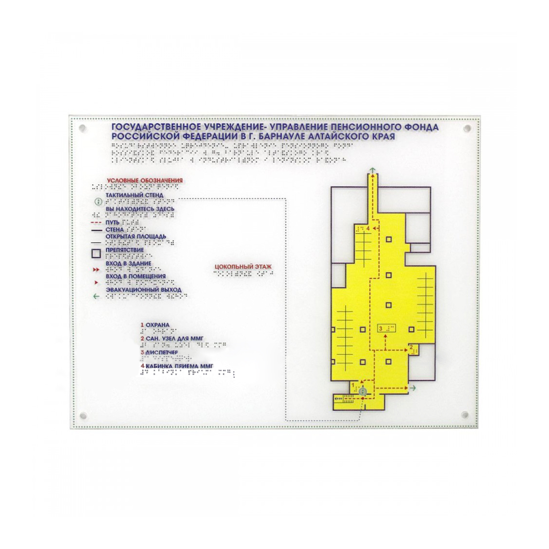 Тактильная мнемосхема – это особенное тифлотехническое средство для пространственного ориентирования людей с ограничениями по зрению, выполненная с применением тифлографической схемы и текстовой информации, дублируемой по системе Брайля. Мнемосхема легко монтируется с помощью дистанционных держателей, что позволяет разместить её в любом, даже малогабаритном помещении.