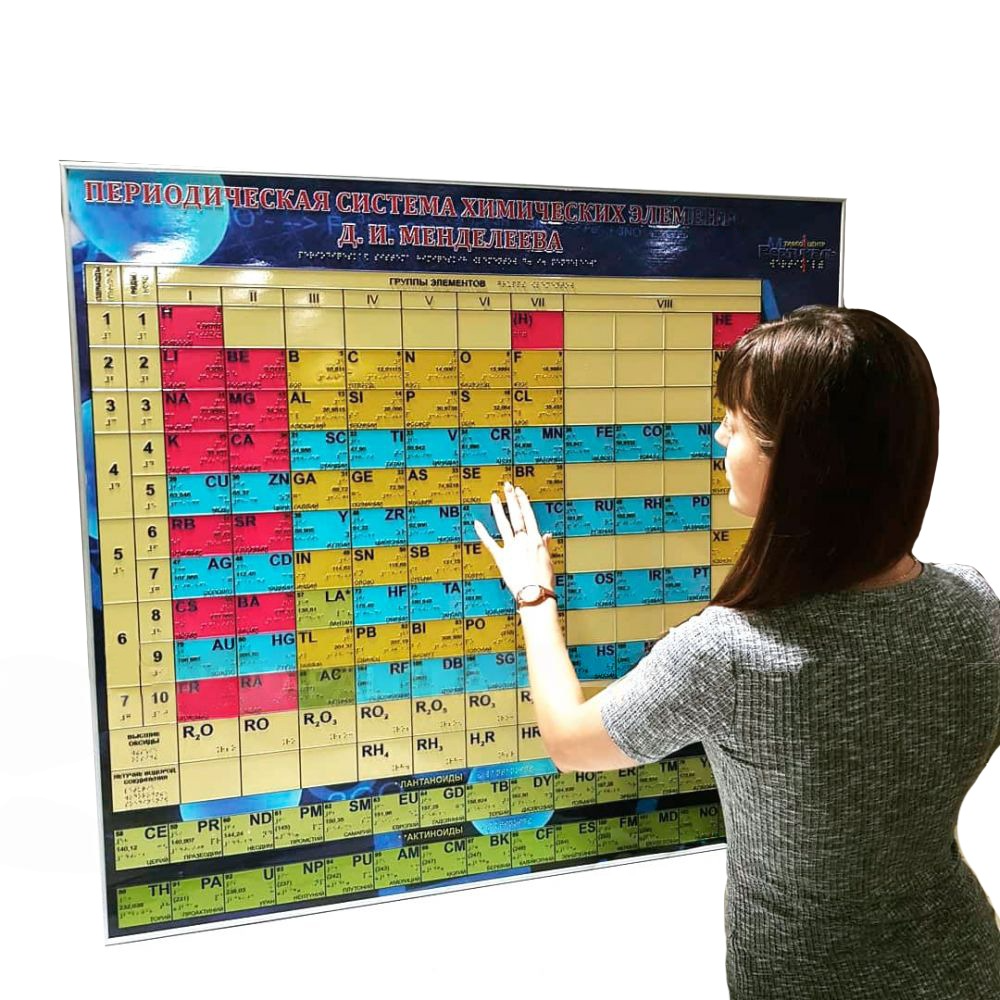 Тактильный стенд "Периодическая система химических элементов (таблица Менделеева) - является графическим выражением периодического закона, открытым русским ученым Д.Менделеевым. Разработан специально для незрячих и слабовидящих людей. Стенд включает в себя наглядную и тактильную информацию, продублированную точечным шрифтом по системе Брайля.
