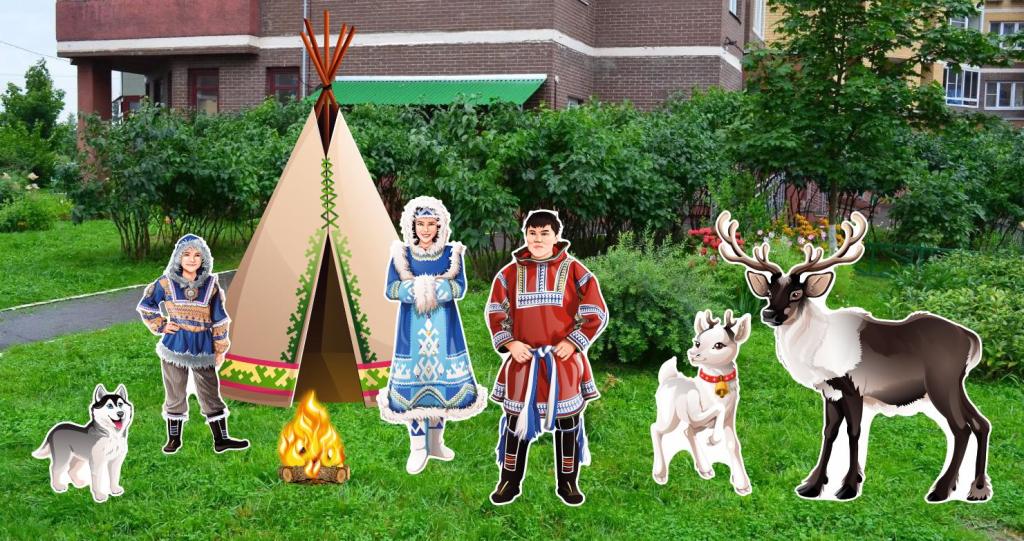 Композиция уличных фигур "Хантыйское стойбище" состоит из семи отдельностоящих фигур: семьи хантов, хаски, двух северных оленей, костра и объемного чума. Фигуры выполнены из ПВХ с нанесением полноцветного рисунка, покрытого защитной пленкой. Объемный чум состоит из металлического каркаса, обтянутого баннерной тканью окрашенной в цвет шкуры с нанесенным этническим узором. Используемые материалы безопасны и устойчивы к атмосферным воздействиям, а конструкция гарантирует долговременное использование.