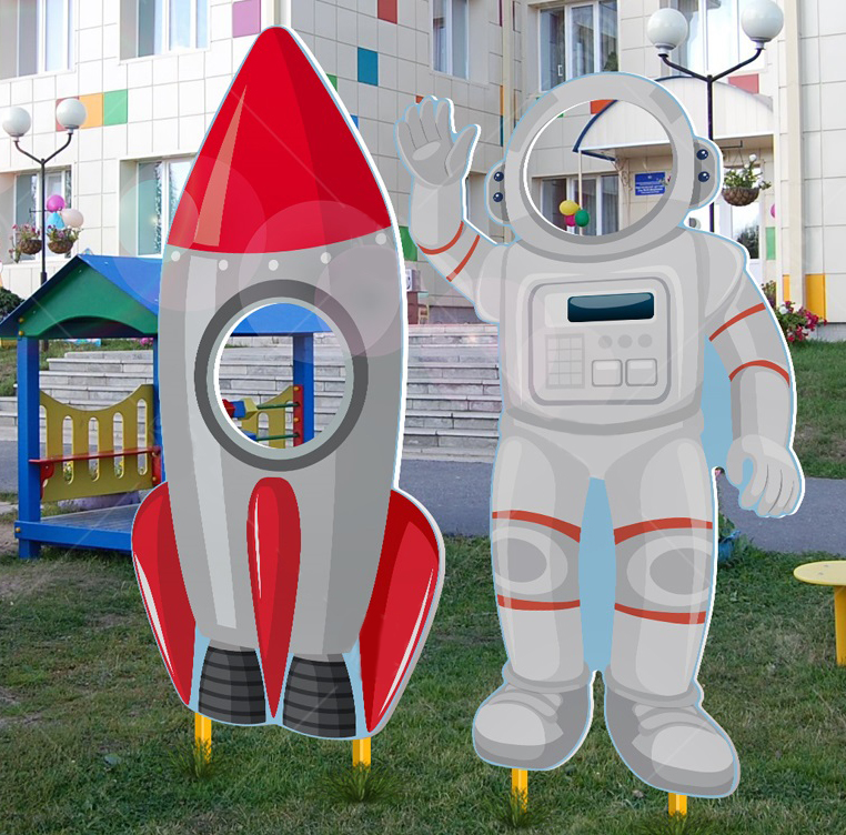 Композиция уличных фигур "Ракета и космонавт" выполнена из ПВХ с нанесением полноцветного рисунка, покрытого защитной пленкой. Используемые материалы безопасны и устойчивы к атмосферным воздействиям, а конструкция гарантирует долговременное использование.