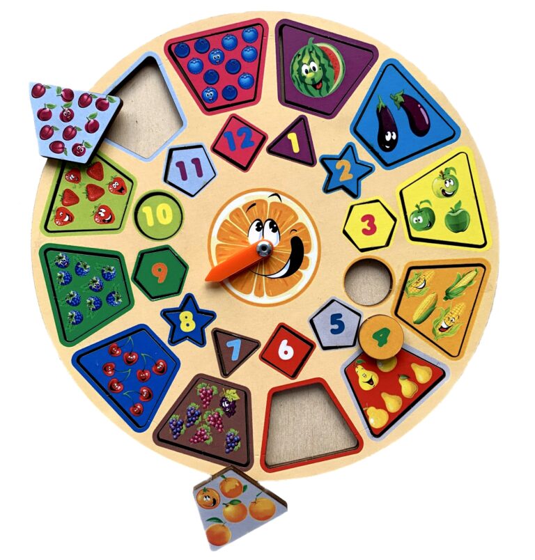 Рамки – вкладыши представляют собой деревянный круг со стрелками и выемками для геометрических фигур. Геометрические рамки распложены по кругу в два кольца. На первом кольце — геометрические фигуры с изображением цифр от 1 до 12, на втором — соответствующее количество изображенных фруктов. Посередине прикреплены стрелки — короткая обозначает часы, длинная — минуты.