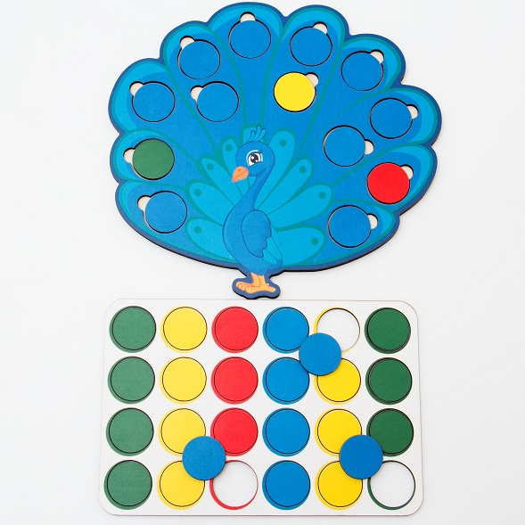 Выложите все заплатки кружки Павлина и выдавите все кружочки с палитры-основы, затем перемешайте. Попросите ребёнка выбрать из всех кружков нужные только для сбора Павлина и заполните этими заплатками недостающие элементы.