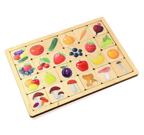 Игра развивающая из дерева «Овощи-Фрукты-Ягоды-Грибы» сделана по пазловому принципу.