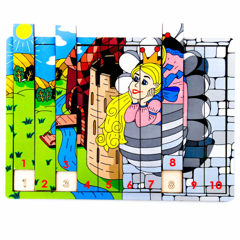 Деревянная панель с цифрами от 1 до 10 и палочками, на которых изображены части картины из сказки. Палочки так же пронумерованы от 1 до 10.