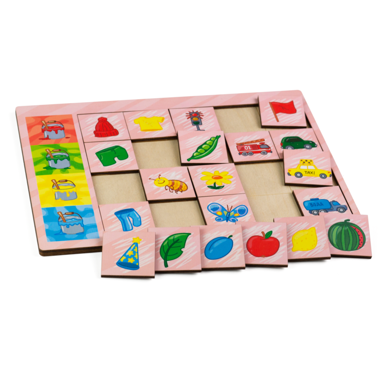 Ребенку необходимо правильно собрать 4 ряда квадратов с изображением предметов по всем 4 цветам. Другими словами — классификация по цветам.