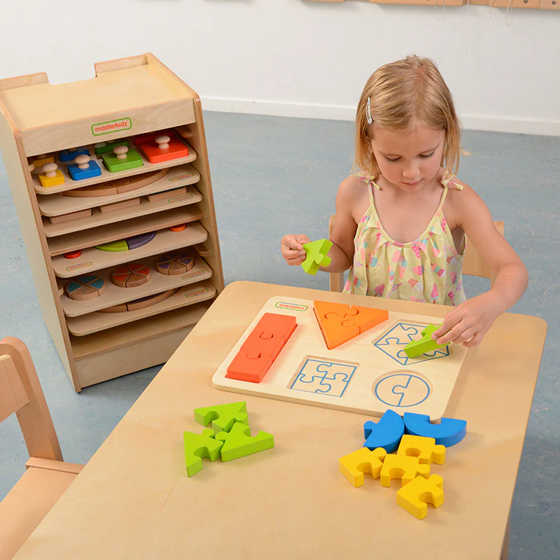 Панель выполнена из березовой фанеры, размер 38 х 28 х 2,5 см. На поверхности панели расположены цветные элементы (пазлы), которые в собранном виде представляют следующие фигуры: круг, квадрат, прямоугольник, треугольник и пятиугольник.