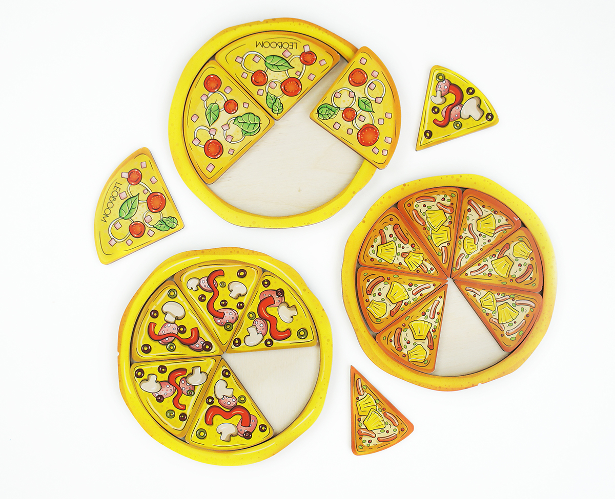 1. Достаньте все кусочки из круглых оснований. Попросите ребенка собрать три пиццы, при этом каждая пицца должна содержать одинаковую начинку. Предложите ребенку придумать названия для каждой пиццы.
