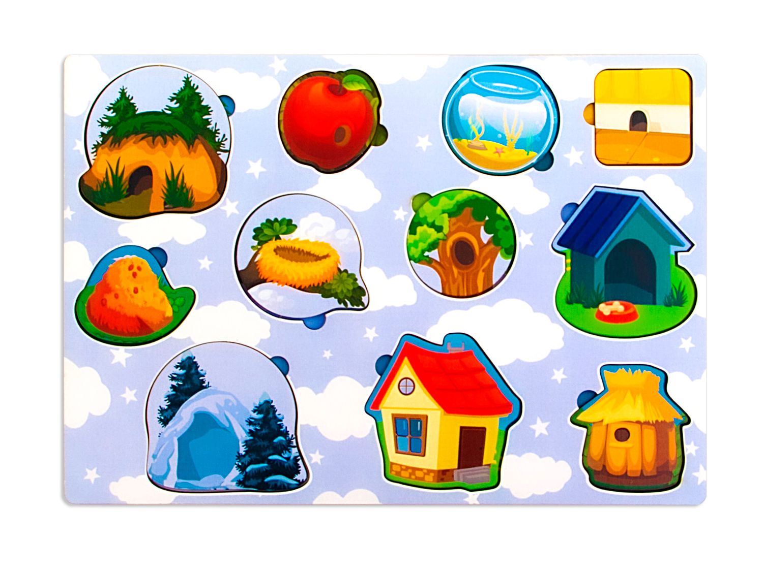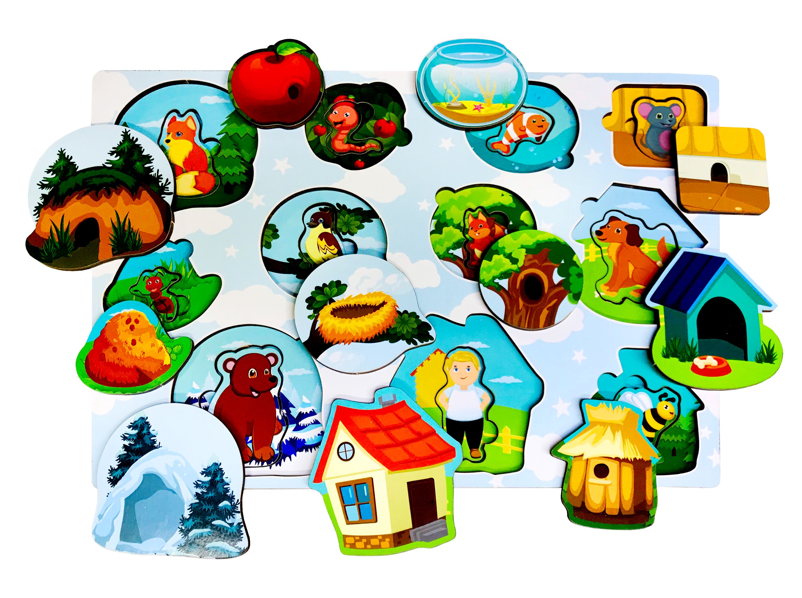 Набор состоит из деревянной панели с тематическими вкладышами и отверстиями соответствующей формы. Лексическая тема: Места обитания животных, насекомых и человека.