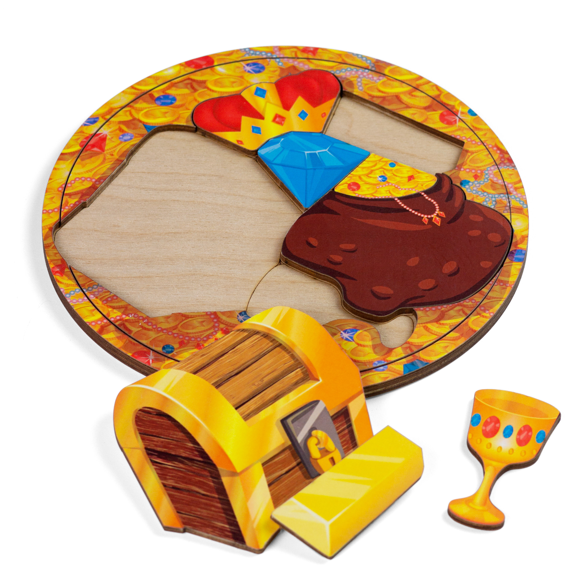 Фигурки, имитирующие различные сокровища: сундук, корона, алмаз, слиток золота, мешок с золотом, чаша золотая.