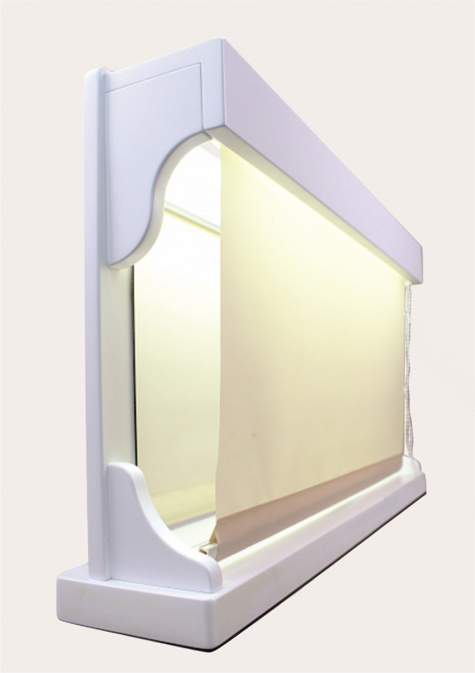 Зеркало дополнено подсветкой и рулонной шторой, которая закрывает зеркало, чтобы оно не отвлекало от других занятий.