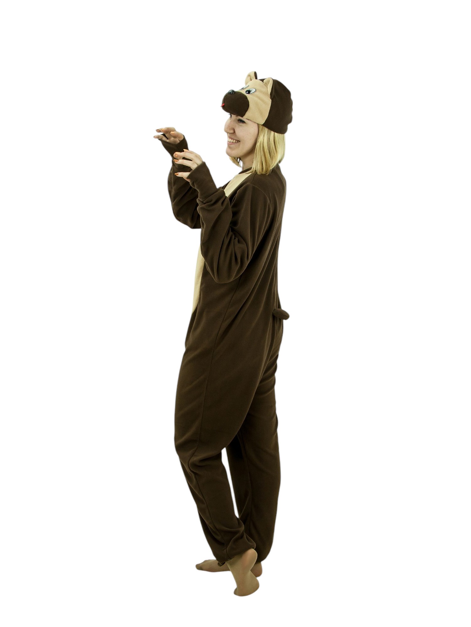 Материал: флис — 100% полиэстер. Комплектация: на комбинезоне застежка молния спереди, сзади — хвостик, по низу рукавов и штанин — резинка, на головном уборе сзади — резинка.