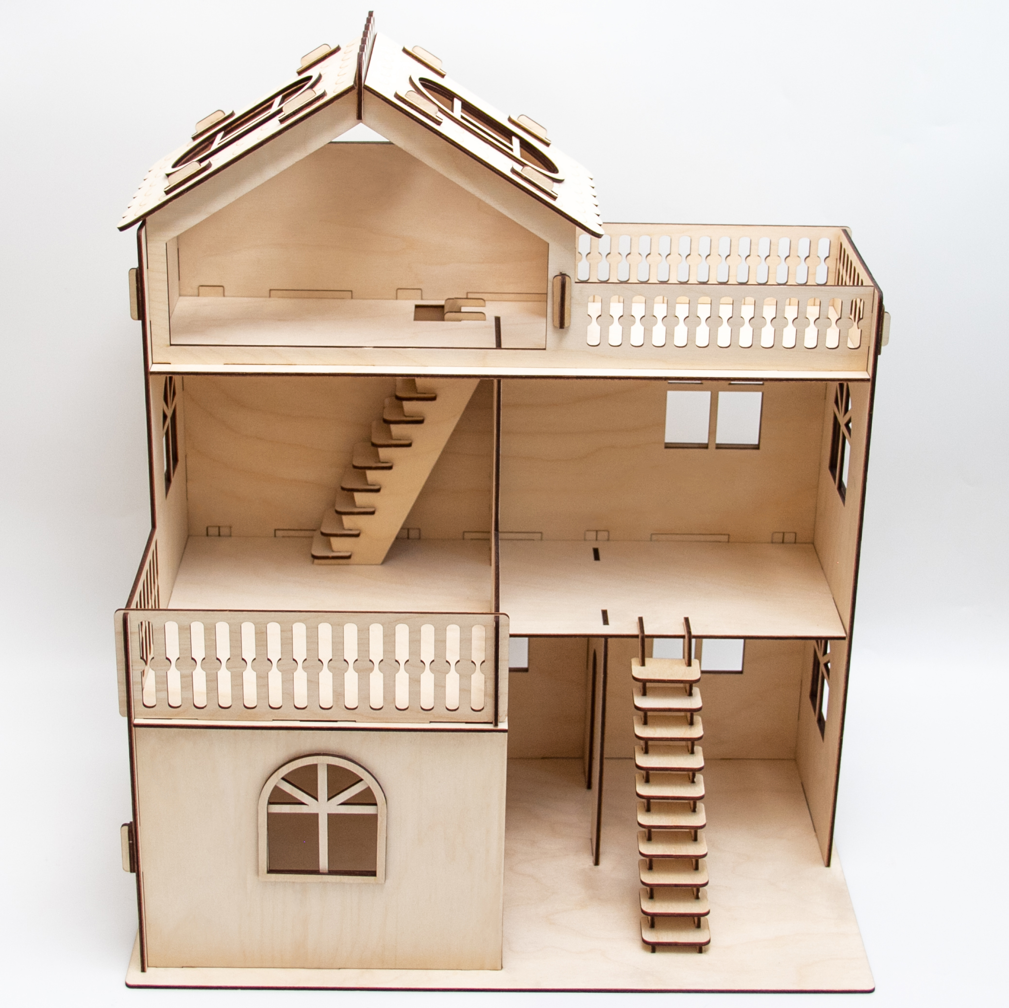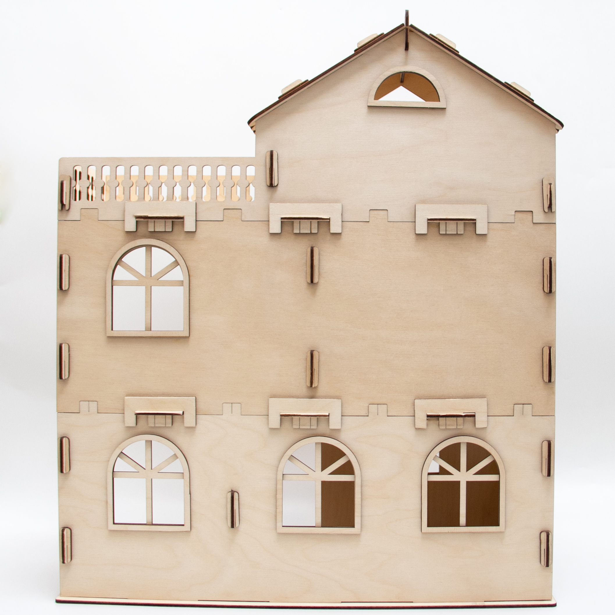Кукольный трехэтажный дом произведен из экологически чистого материала – дерева. Упаковочная коробочка выполнена из древесно-волокнистой плиты высокой плотности. Дом в собранном виде занимает не очень много места в детской комнате, при этом внутри он довольно вместительный и просторный. В доме размещаются следующие зоны: детская, ванная, зона отдыха (балкон), прихожая, кухня, гостиная, спальня. Лучше всего для такого дома подходят куколки и герои ваших любимых мультфильмов высотой до 13 см. Ваши дети смогут проявить свой дизайнерский потенциал, выбирая обои для комнат, планируя максимально комфортную расстановку мебели в помещениях. А стены с внешней стороны можно окрасить акриловыми или гуашевыми красками. Изделие выполнено из гладкой березовой фанеры, не имеющей заусенцев, поэтому удобно для покраски. Товар сертифицирован. Безопасен для детей. Все детали аккуратно вырезаны в листах фанеры, они просто вынимаются из прорезей и можно приступать к сборке. В комплект входит инструкция по сборке. Дополнительно можно приобрести наборы мебели под каждую зону в домике.
