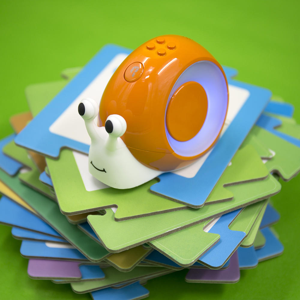 Программные карты выстраиваются в маршрут. После чего, робот-улитка считывает информацию с карточек датчиком, расположенном на дне улитки, и выполняет соответствующие команды.