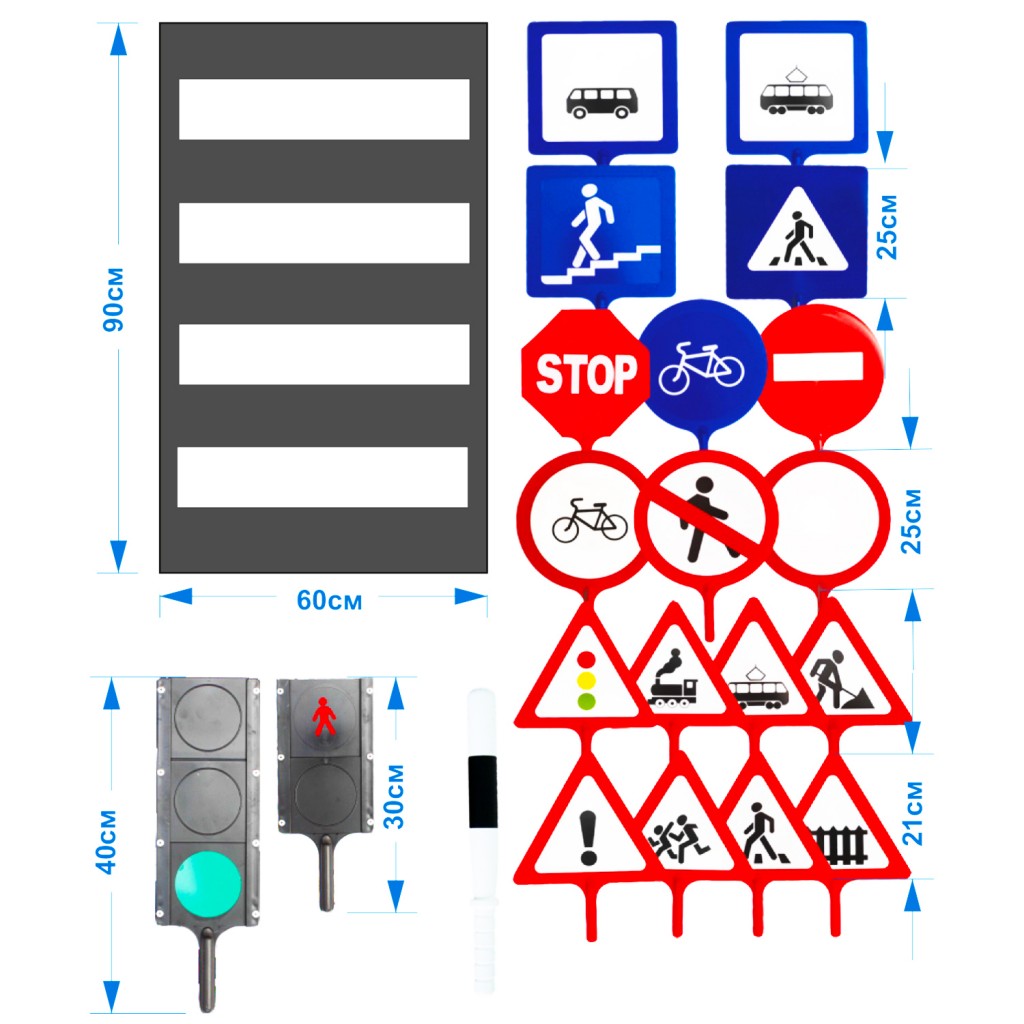 знак 18 шт., светофор 2 шт., жезл регулировщика 1 шт., пешеходная дорожка 1шт.