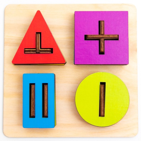 Геоборд Геометрия представляет собой однотонную панель с деревянными штырьками для нанизывания геометрических фигур. Геометрические фигуры с отверстиями.