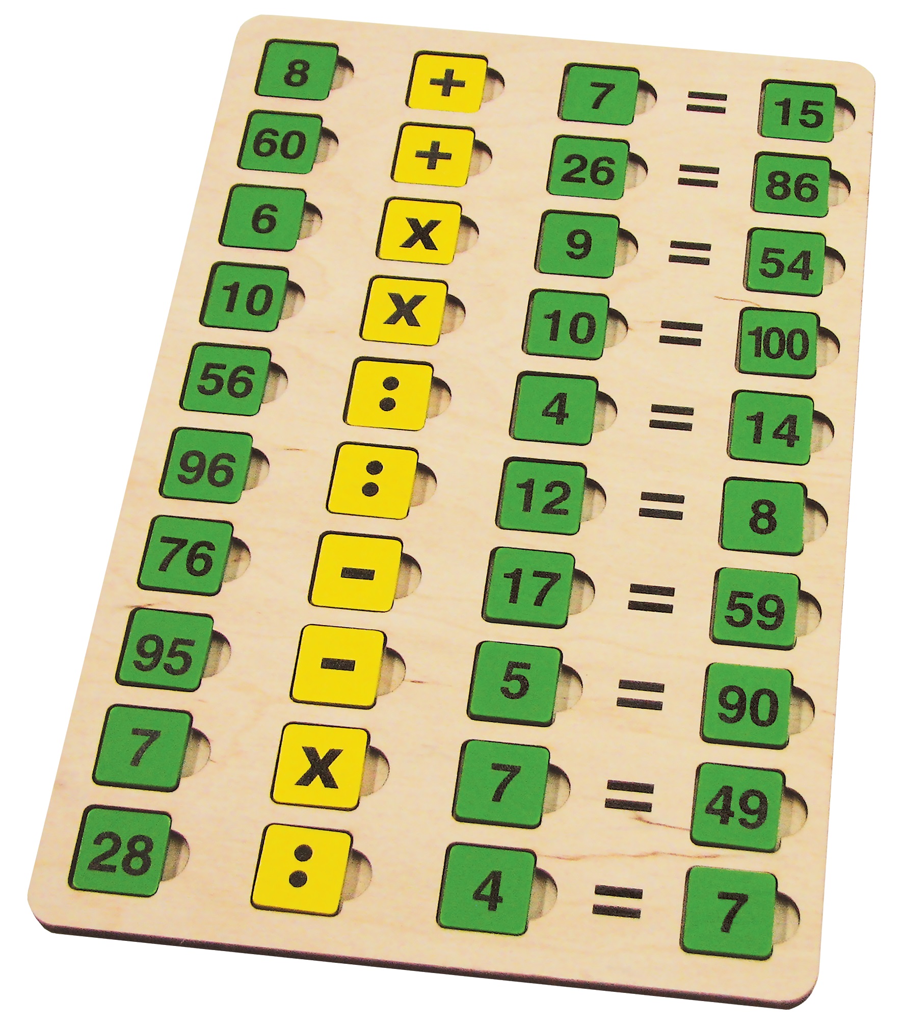 Настольная игра-пазл «Большая деревянная арифметика» (серия «Учись, играя!»). Состав игры: деревянное игровое поле – 1 шт. (30 х 20 см), деревянные фишки с числами (зелёного цвета) – 210 шт. (22 х 22 х 3 мм), деревянные фишки с арифметическими знаками (жёлтого цвета) – 40 шт. (22 х 22 х 3 мм). Материал: берёзовая фанера. Для детей от 3 лет. Игра формирует начальные представления о простых арифметических операциях, развивает логику и память, прививает интерес к такой важной науке, как математика.