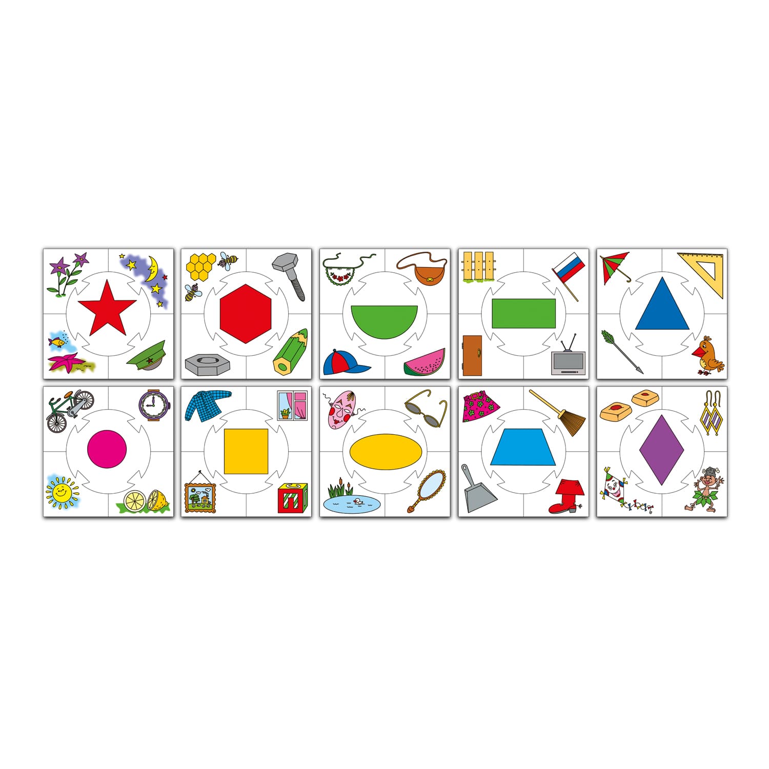 Настольная игра «Фигуры» (серия «Учись, играя!»). Состав: круглые карточки – 10 шт., карточки – 40 шт. Материал: бумага, картон. Для детей от 3 лет. Тренирует наблюдательность, внимание и мелкую моторику пальцев рук, развивает образное мышление, знакомит с формами и названиями 10 простых геометрических фигур.