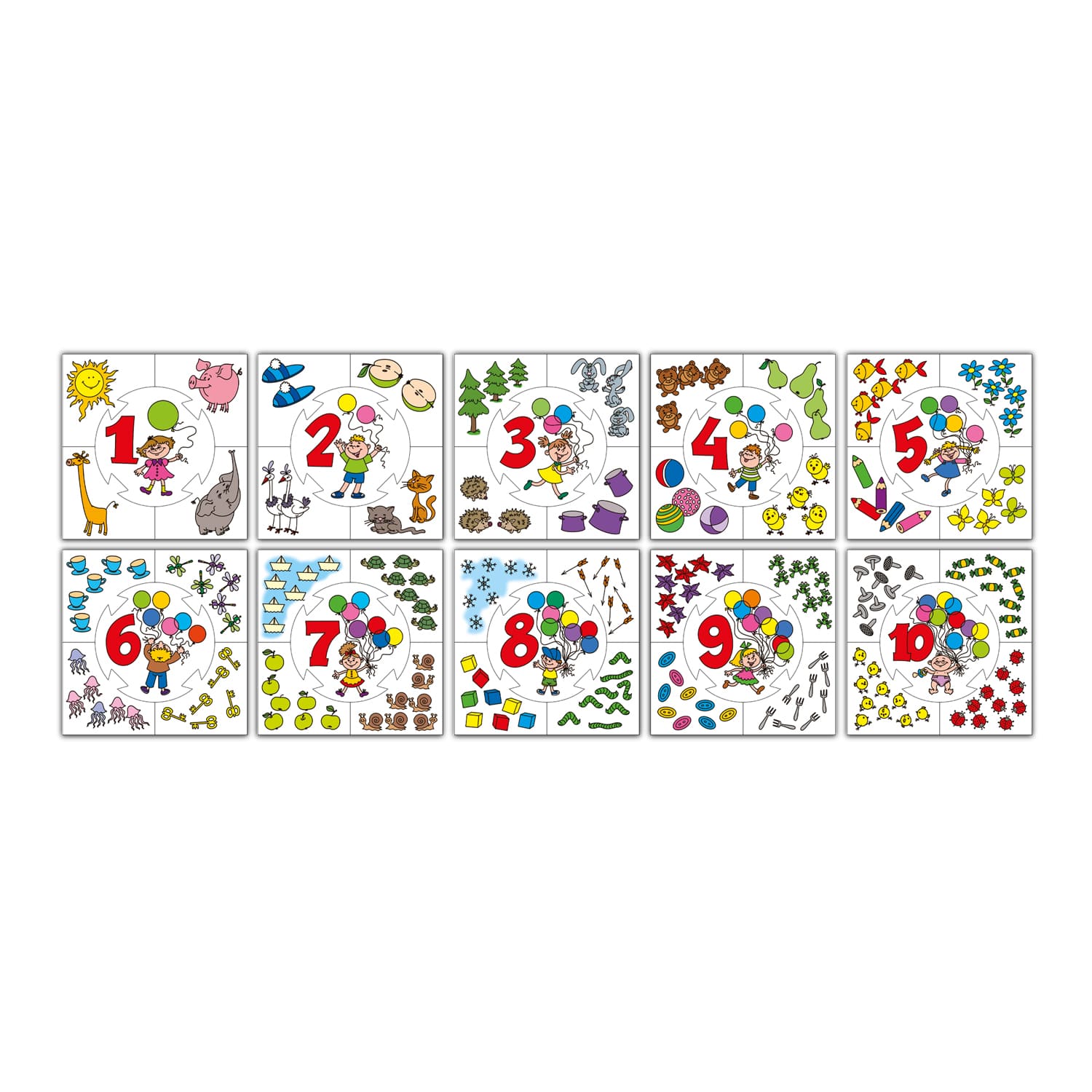 Настольная игра «Цифры» (серия «Учись, играя!»). Состав: круглые карточки – 10 шт., карточки – 40 шт. Материал: бумага, картон. Для детей от 3 лет. Тренирует наблюдательность, внимание и мелкую моторику пальцев рук, развивает образное мышление, знакомит с цифрами от 1 до 10, учит сопоставлять цифру с количеством объектов на картинке.