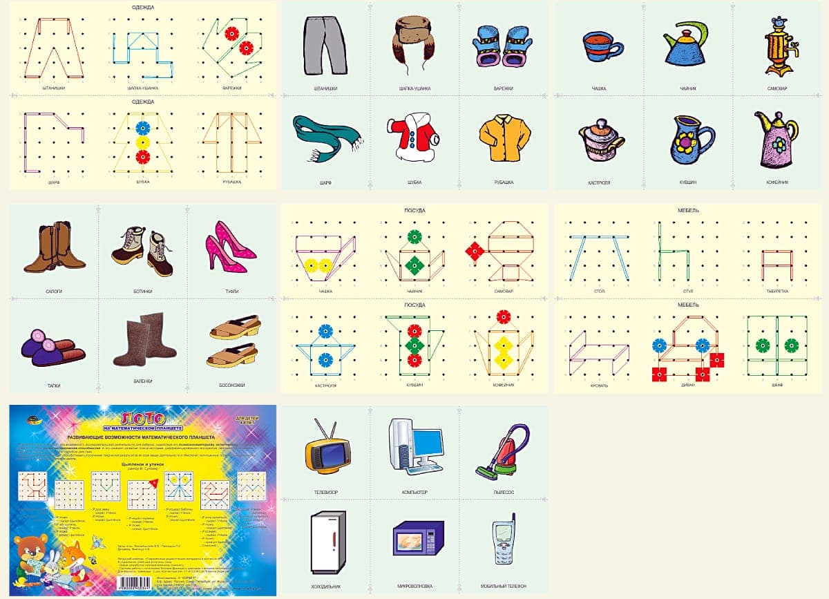 Игровой материал в ЛОТО – изображения предметов рукотворного мира, объединенные в соответствии с лексическими темами: «Одежда», «Посуда», «Бытовая техника», «Мебель», «Обувь», «Инструменты «. По каждой теме даны тематические карты с рисунками предметов и 6 карточек-схем. Для игры необходимо поле математического планшета с резинками. В лото можно играть всей семьей, в группе детского сада, с друзьями; может играть и один ребенок.