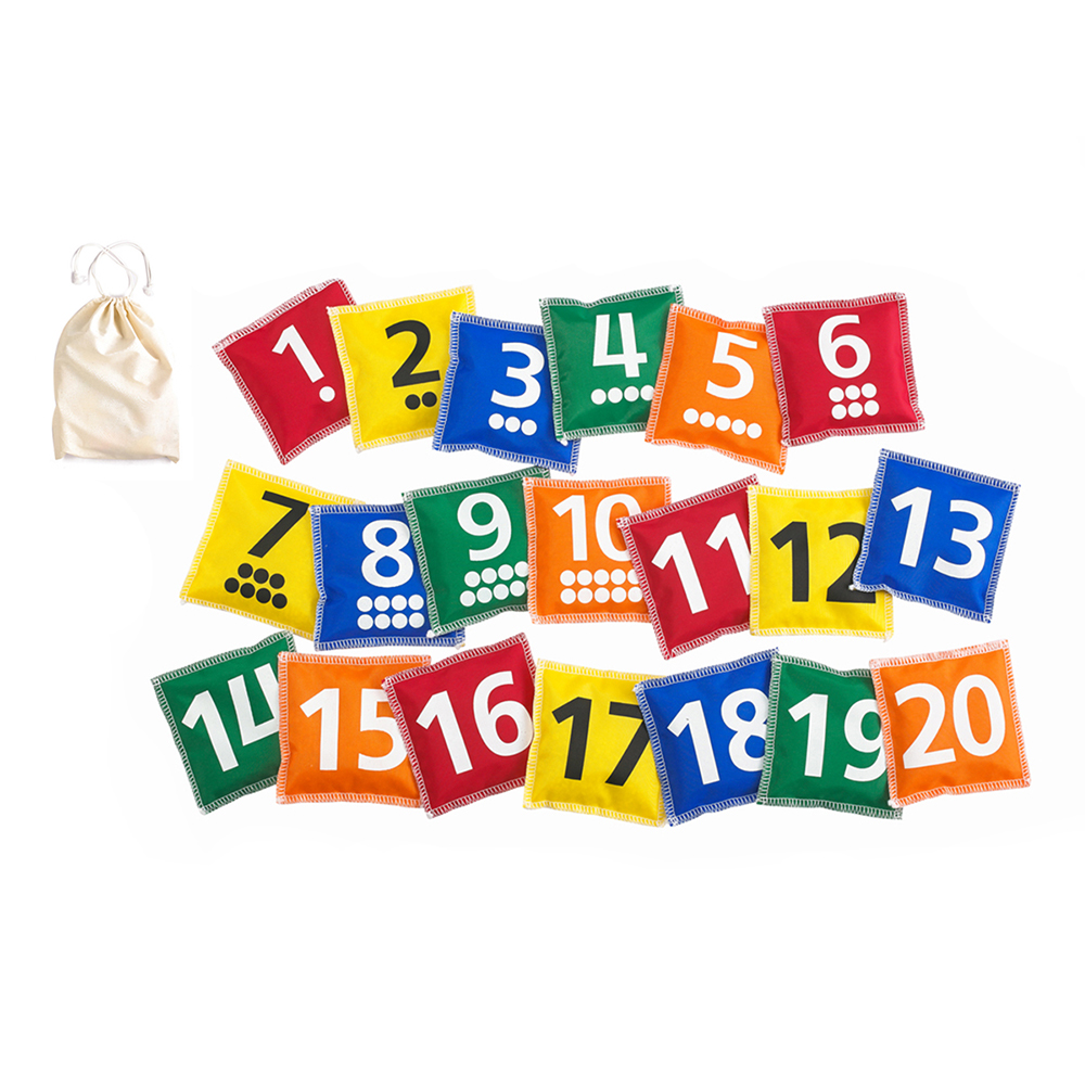 В наборе: мешочки-числа от 1 до 20 (с сыпучим материалом внутри) в 5 цветах и сумка для хранения.