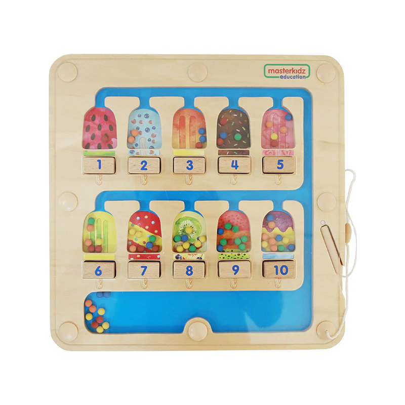 Панель представлена в виде магнитного лабиринта, на котором изображено 10 разноцветных эскимо. Используя магнитную ручку, необходимо разместить количество шариков соответствующему эскимо: по цифре или количеству точек.