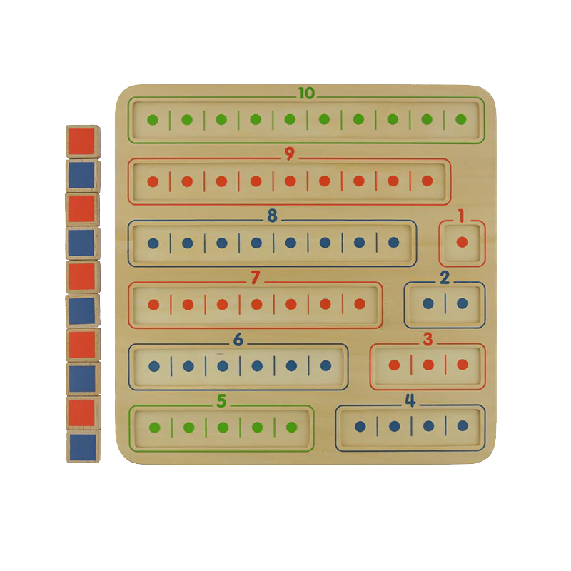 Основание панели выполнено из березовой фанеры, на которой слева представлены 5 пронумерованных и отмеченных цветными точками линий-выемок для раскладки фишек, справа расположены фишки в синем и красном цветах. Панель учит складывать простые числа от 1 до 10.