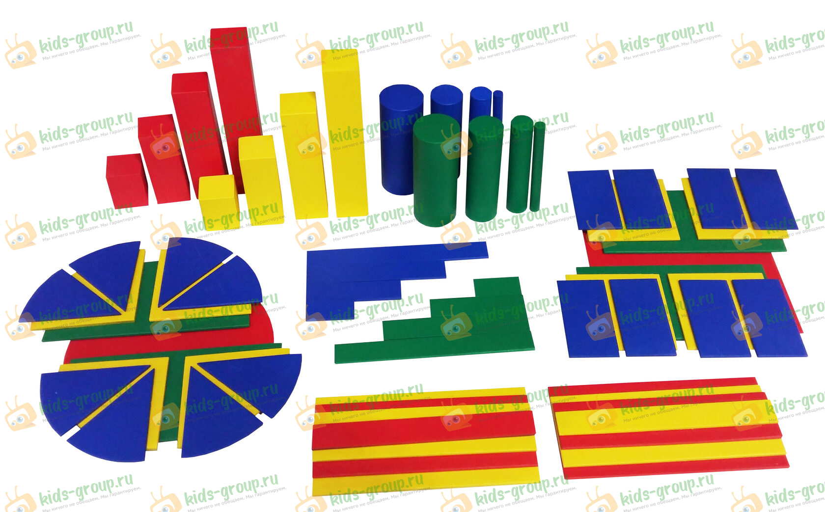 Два набора, состоящие из целых предметов и этих же предметов, но разделенных на 2, 4, 8 равных частей (геометрические