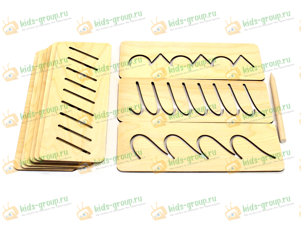 В комплекте: 10 трафаретов-прописей с различными прорезями графических фигур от простого к сложному, деревянный стилус (палочка для письма).