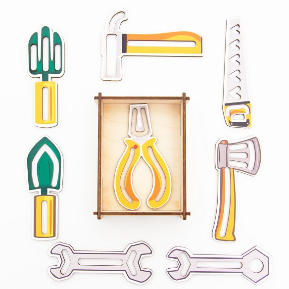 Набор трафаретов и деревянной коробочки для их хранения. Коробочку можно дополнительно использовать как материал для игры, разбирать и складывать обратно, развивая логику и мелкую моторику. В наборе присутствуют детали: пила, топор, плоскогубцы, молоток, два гаечных ключа разных видов, лопата и грабли.