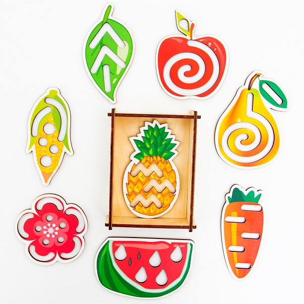 фрукты: груша, аннуровка с контурами фигурок для шнуровки, шнурком и самими фигурками. Контуры усложняют задачу, необходимо не просто прикрепить с помощью специального шнура на основу фигурки, (большого слона, маленького слона, большую бабочку, маленькую бабочку), но и правильно соотнести эти фигурки с контурами. Здесь хорошо тренируются сенсорные эталоны. Ребенок должен правильно положить все фигурки на их контуры и прикрепить шнуром к панели.