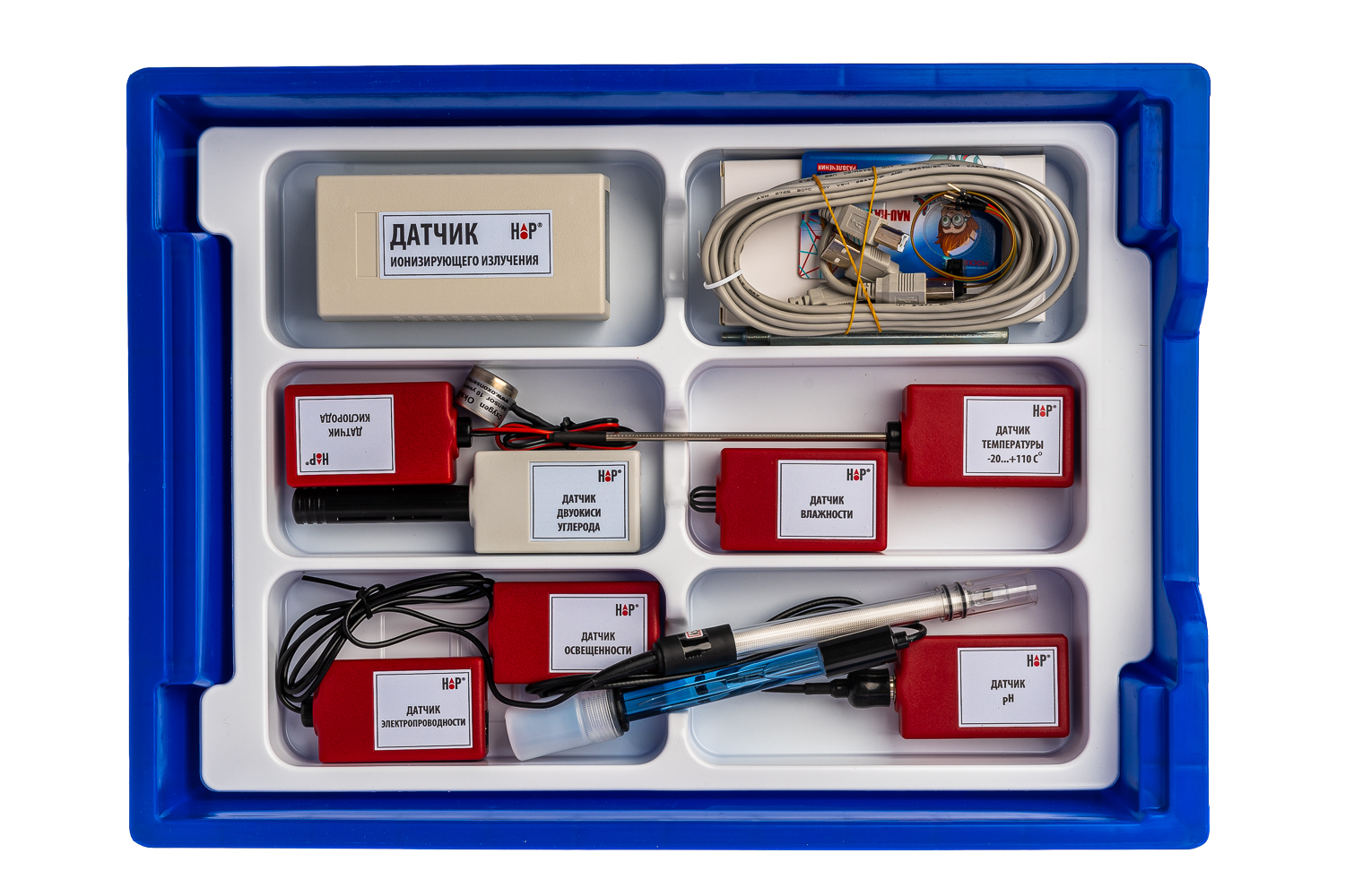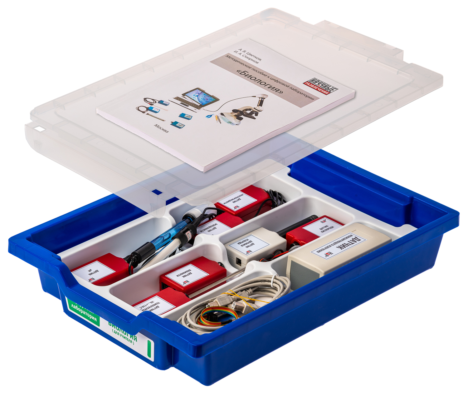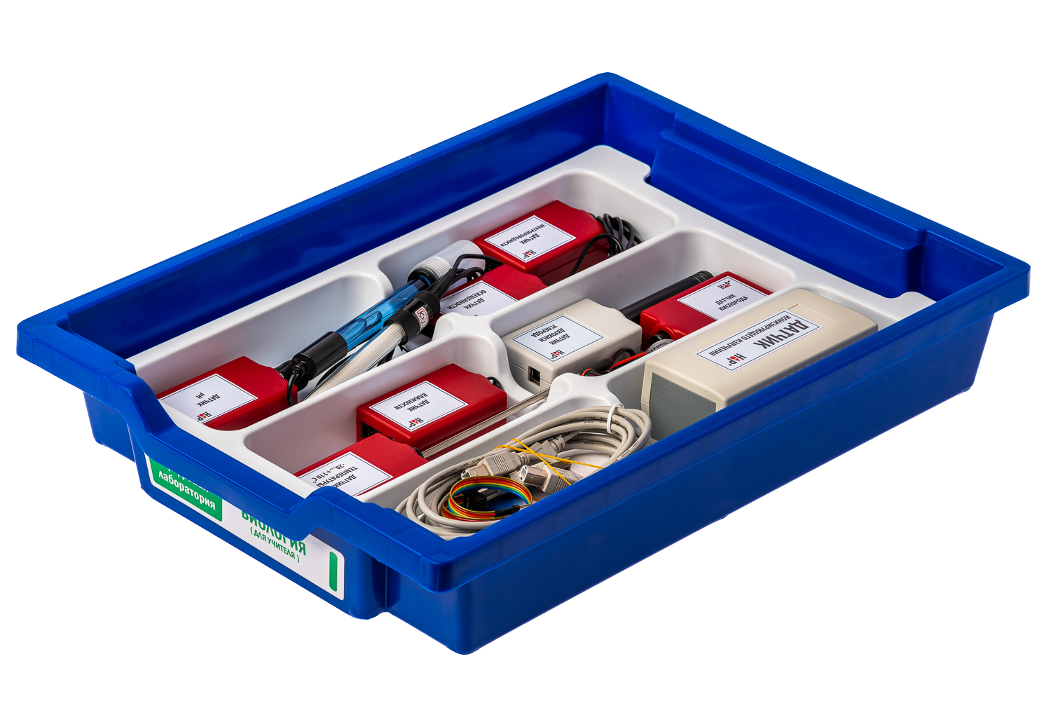 Состав — Комплект беспроводной передачи данных — Цифровой Р-датчик температуры (диапазон измерений от -20 до +110 градусов Цельсия) — Цифровой Р-датчик влажности (диапазон измерений от 0 до 100%) — Цифровой Р-датчик освещенности (диапазон измерений от 0 до 188000 лк) — Цифровой Р-датчик электропроводности (диапазон измерений от 0 до 10 мСм/см) — Цифровой Р-датчик рН (диапазон измерений от 0 до 14 ед. pH при 20 градусах Цельсия) — Цифровой Р-датчик кислорода (диапазон измерений от 0,1 до 100%) — Цифровой датчик двуокиси углерода (диапазон измерений от 0 до 10000 ppm) — Цифровой датчик ионизирующего излучения (диапазон измерений от 0 до 1000 мкР/ч) — Цифровой датчик концентрации частиц пыли (диапазон измерений от 0,3 до 10 мкм) — Микроскоп — Цифровая видеокамера — Весы электронные учебные (максимальный предел взвешивания 200 грамм) — Стержень для закрепления в штативе (2 штуки) — Кабель соединительный (2 штуки) — Кабель соединительный для IDC разъема — Набор для изготовления микропрепаратов — Набор микропрепаратов (12 штук разных срезов) — Методическое обеспечение на русском языке — Программное обеспечение для проведения экспериментов — Система хранения Цифровая лаборатория (за исключением микроскопа и цифровой видеокамеры) укомплектована в пластиковую систему хранения, которая закрывается прозрачной пластиковой крышкой на защелках для обеспечения наблюдения за содержимым. Комплект оборудования и датчики в системе хранения располагаются на ложементе. Микроскоп и цифровая видеокамера имеют отдельные упаковки.