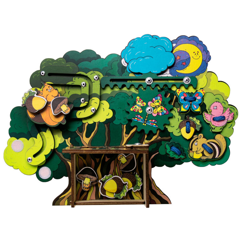 На панели находятся: лабиринт с двигающейся белочкой. Белочка имеет липы, чтобы прикладывать грибочки и желуди на липах. Так же на панели прикреплен ящичек для хранения грибочков и желудей на липах. Ящичек с крышкой, у которой есть отверстия в форме грибочка и желудя для сортировки. Ящичек можно закрывать на задвижку.