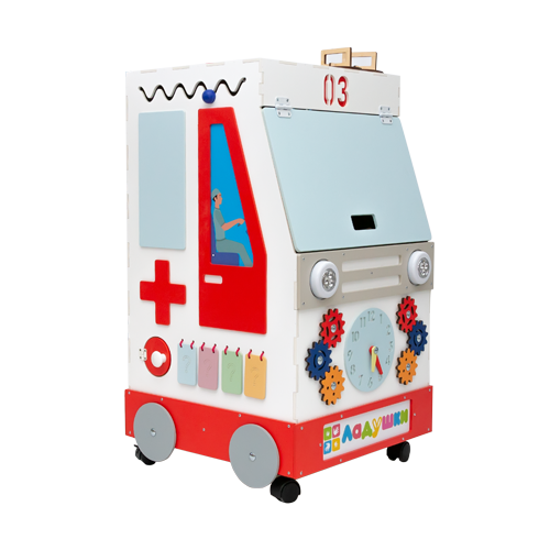 На объемном бизиборде есть все традиционные развивающие элементы: шестеренки, часы, карточки-мемори, разные лабиринты. На крыше у скорой помощи — настоящий реанимационный набор, с помощью которого можно примерить на себя роль врача.