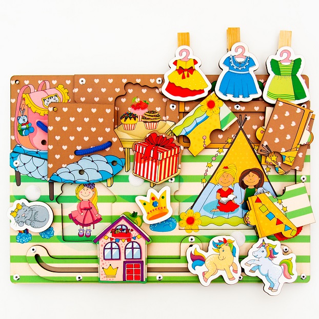 Прямоугольная деревянная панель: на панели находится встроенный пазл со спрятанной сюжетной картинкой, которая находится под пазлом, потайные вкладыши, со спрятанными изображениями сладостей, девочки, потайная картинка с изображением рюкзака со шнуровкой. Также бизиборд имеет корону и кошечку на липах, которые можно перемещать на свободные липы. Наверху бизиборда расположен шнурок, который можно регулировать по длине. На шнурке прищепками прикреплены разные платья. Внизу бизиборда находится лабиринт с двигающимися игрушками единорогами.