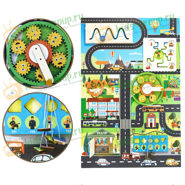 Бизиборд ГОРОД. Школа поможет сформировать у детей общие представления о жизни в городе; расширит представления детей о службах спасения, общественном и муниципальном транспорте; познакомит детей с людьми с ограниченными возможностями здоровья; поможет закрепить знания детей об основных знаках дорожного движения.ТМ "Рыжий Тим"
