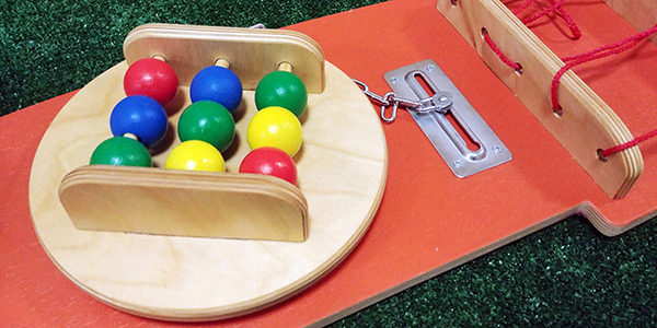 Бизиборд для детского сада. На панели расположены развивающие элементы по различным направлениям (мелкая моторика, тактильное восприятие, память, концентрация и т.д.).