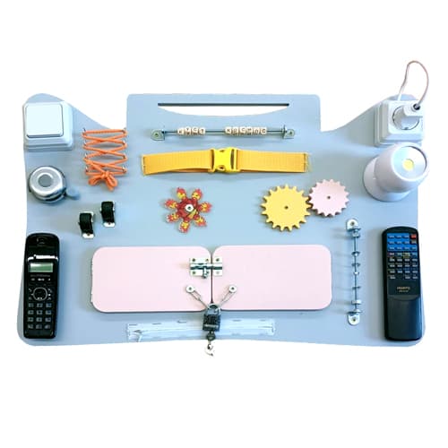 Развивающие элементы: вилка с розеткой, выключатель, бусины на стержне, шнуровка, застежка на ремне, спинер, колесики, звонок, пульт, дверцы открывающиеся, замочки металлические, замок-молния пластик, лампа