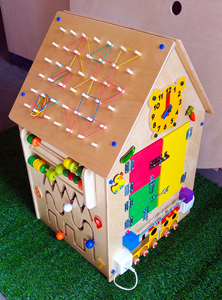 Развивающий домик-бизиборд для детских садов и прочих образовательных учреждений. Каждая сторона предназначена для развития различных навыков. Пригоден для использования детьми с ограниченными возможностями здоровья.
